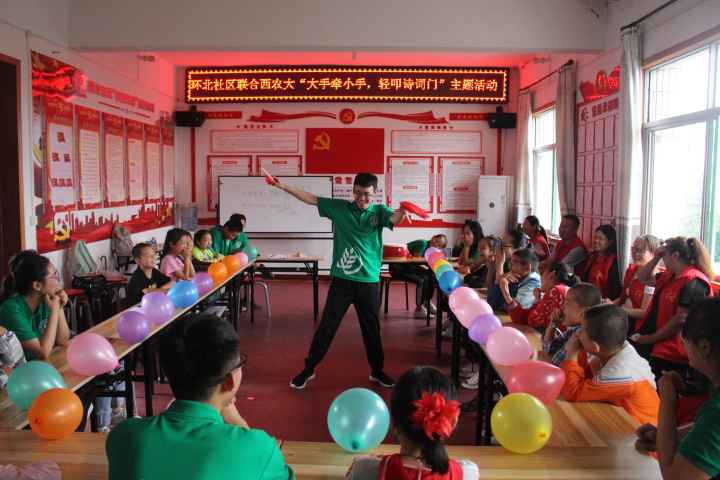 为了增加孩子们的诗词文化储备,丰富他们的学习生活,陕西省合阳县城关镇街道办环北社区的工作人员与西北农林科技大学2019暑期“三下乡”赴合阳县城关镇脱贫攻坚和振兴乡村服务队于7月17日下午3点在办事处会议室联合举办了名为“大手牵小手,轻叩诗词门”的主题活动。