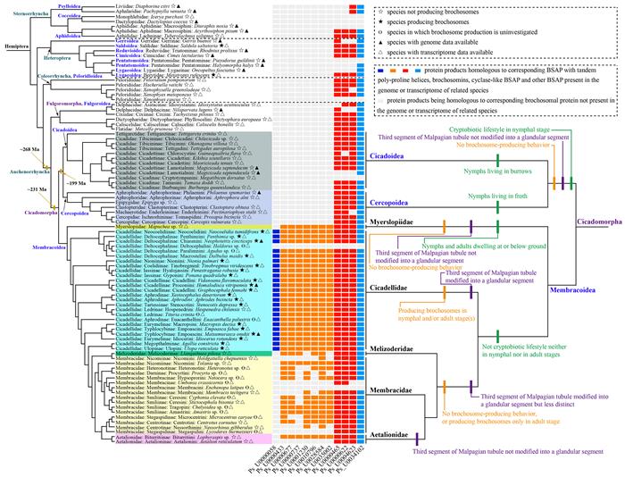 图2 半翅目系统演化(左)与网粒体蛋白组成(中)、马氏管分化、栖息地分化(右)的相关性