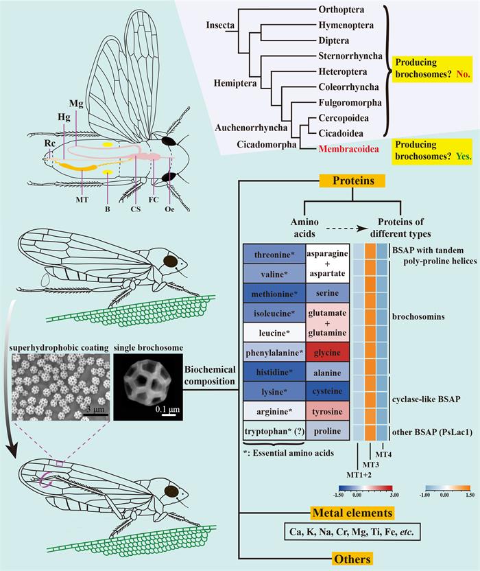 该研究在测定了条沙叶蝉 Psammotettix striatus 网粒体化学组成基础上,鉴定、分析了参与网粒体蛋白合成的特有基因,并通过形态学、行为学和系统发育分析,探讨了网粒体蛋白合成与昆虫食物、马氏管形态功能特化、行为分化及内共生菌之间的潜在相关性。研究结果表明,网粒体主要由甘氨酸、酪氨酸富集的蛋白质组成,并含有Cr、Ti、Fe等金属元素(图1)。网粒体蛋白含虫体非必须氨基酸和食物中缺乏的必需氨基酸,部分必需氨基酸只能依靠相关内共生菌获得;参与网粒体蛋白合成的基因只在马氏管膨大的腺体段特异性高表达,表明网粒体在该段合成(图2)。马氏管的形态、功能特化(合成网粒体)与足的形态功能特化(涂抹网粒体),协同促进了角蝉总科昆虫对不同生境的适应,也促进了该类昆虫的多样性分化,使其成为昆虫纲中物种多样性最丰富的类群之一。